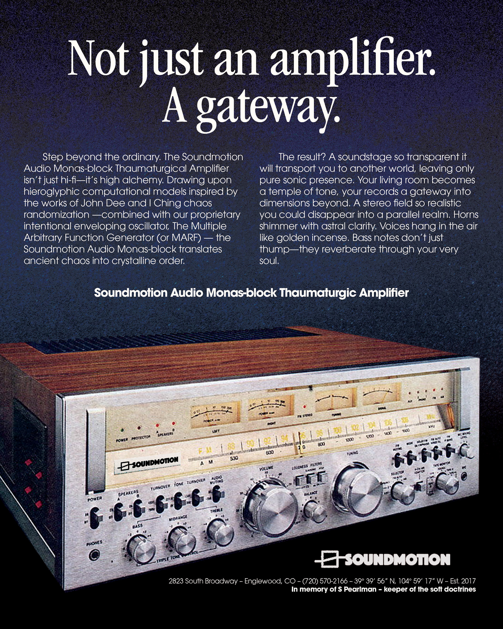 The seventies were the halcyon days for high-end stereo equipment. We shifted our development away from live performance oriented amplifiers to smaller, more portable “prosumer” devices. We found willing dealers in the myriad of stereo shops where in the back room, catering to affluent customers, our monas-block amplifiers reigned supreme; delivering a steady supply of dollars to fund our research. This proved to also be an effective recruitment tool for like-minded engineers, toiling away in the service department as they realized the potential of our proprietary thaumaturgic components. Modern alchemical wizards hidden in plain sight in the back rooms of stereo shops that dotted the country’s strip malls.